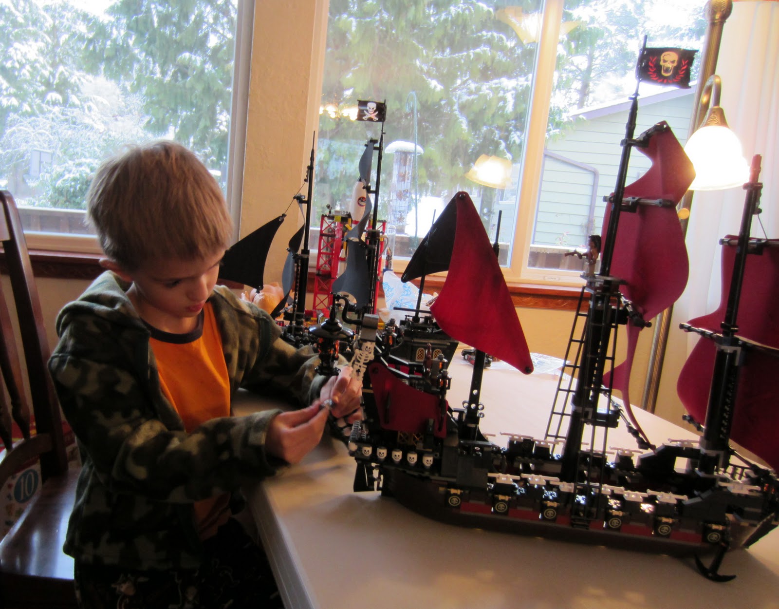 Lon wanted to wear his new hoody while setting up an epic battle between the Black Pearl and the Queen Anne's Revenge