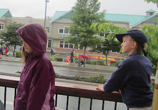 Playing with his free balloon. Waiting for the parade. Yes, it is pouring rain.